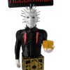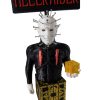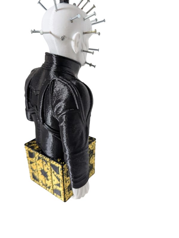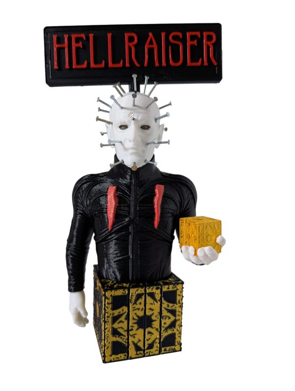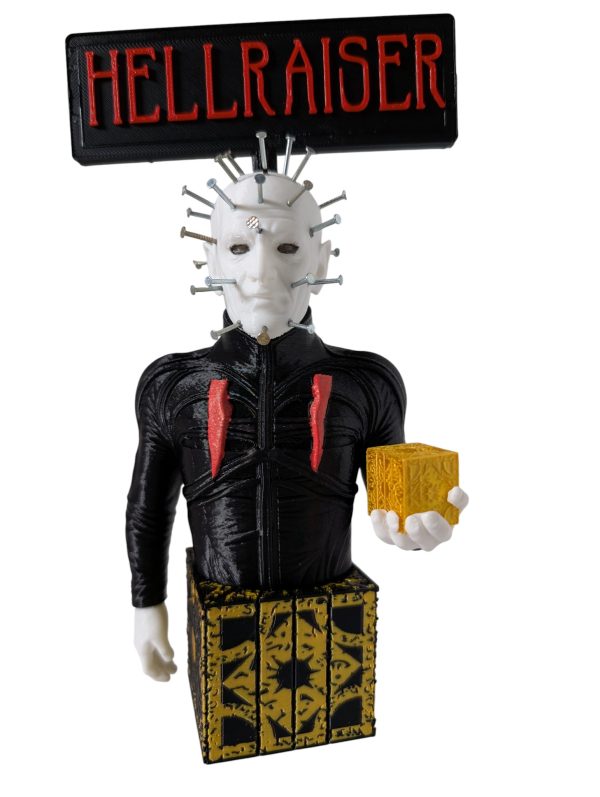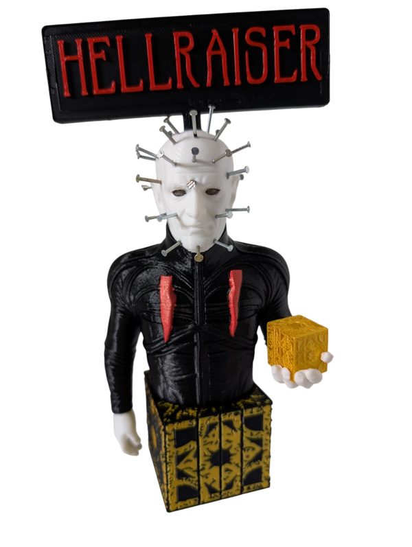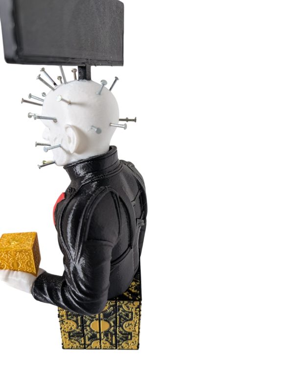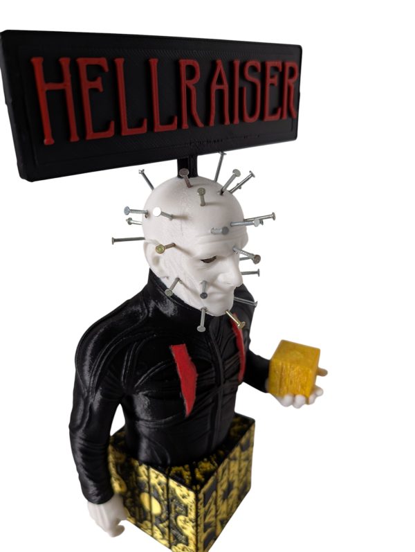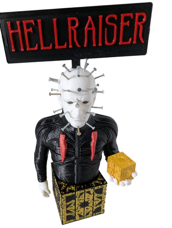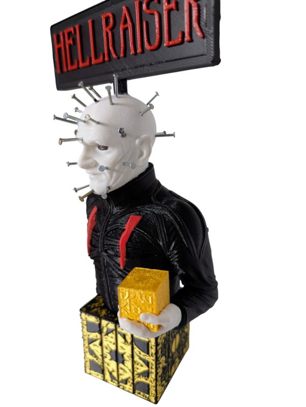 Unleash the terror of classic horror with this Hellraiser Pinhead Display Statue, a striking handmade piece featuring real metal nails. Standing approximately 8 inches tall by 5 inches wide, this 3D display captures the chilling essence of the iconic cenobite from Hellraiser. Crafted with layered texture and painted in bold black, white, and crimson tones, the figure holds the signature puzzle box and features a raised “HELLRAISER” sign above. Perfect for collectors, horror fans, and Halloween displays alike. Durable resin-like construction with metallic accents. Each piece is uniquely hand-finished—no two are exactly alike!