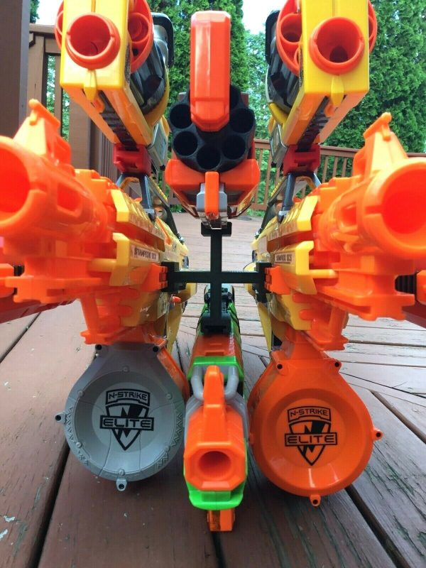 This little device will securely connect 4 Nerf guns together using the rail connector and/or Picatinny. Simply slide on to the four guns you wish to connect and go to war. Holds securely and tightly. Some rails may have a snug fit and require a strong pull to put in place.