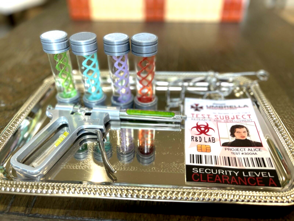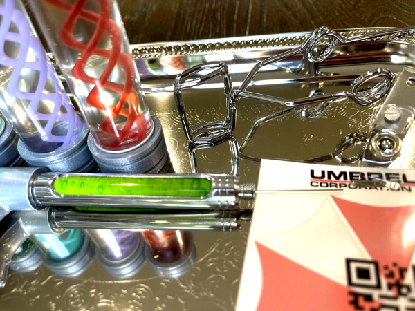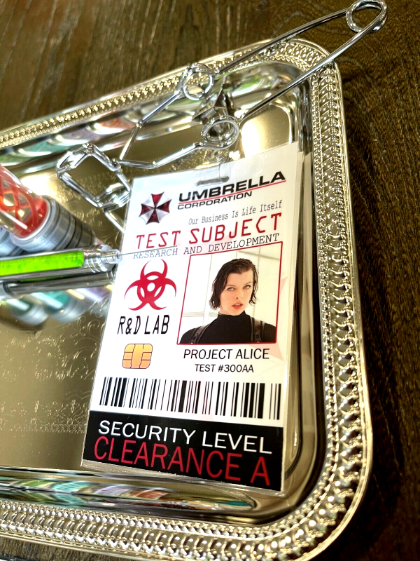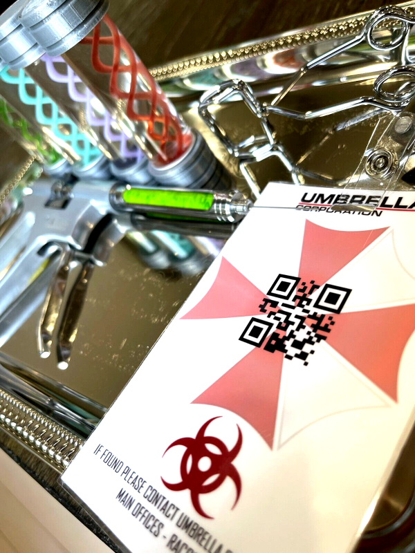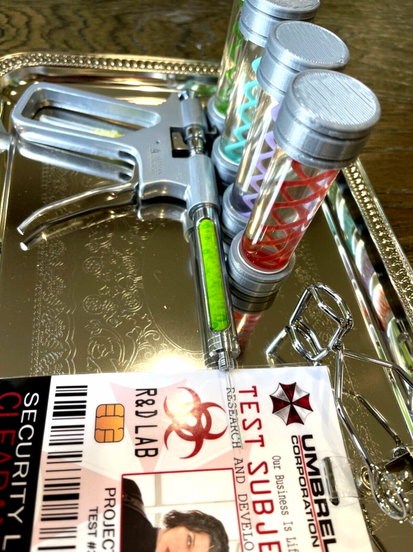 This also Comes with a Metal Syringe with Injector Needle, Metal Tray, and Laminated Custom Umbrella Corp ID Badge with Clip.
