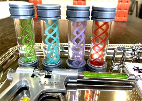 Total of Four Vials with the following Colors inside as shown.  Blue, Green, Purple, Red.